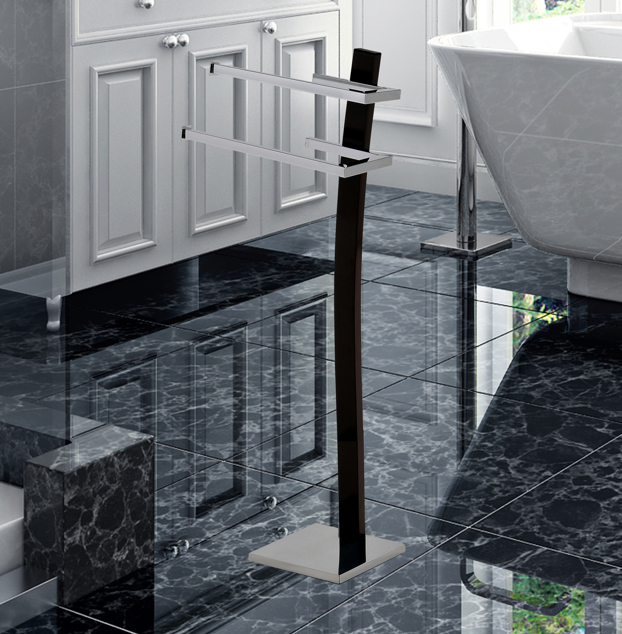Accent your bathroom with the perfect combination of style and craft. This Freestanding Toilet Paper Holder gives the bathroom a modern touch. This Fundamental bathroom necessity boasts the ability to hold an extra toilet paper roll for added convenience. You will also be able to use the item as a Double Towel holder or a Toilet Paper and Towel holder combo as an option. Additionally, its weighted base provides ease of use as it avoids tipping and falling. This Freestanding Double Holders are uniquely designed to bring the convenience of a freestanding, pedestal-style holder with modern decorative style to show off your luxury home. Resistant to daily scratches, corrosion resistant and rust resistant, allowing it to stay in best condition for longer. Beautifully handcrafted and elegantly hand polished contemporary design. Features high caliber metalwork for durability, dependability, resistance to rust, corrosion, and scratching. Add luxury to your bathroom with ease- requires no drilling, installation but w/ minor assembly.